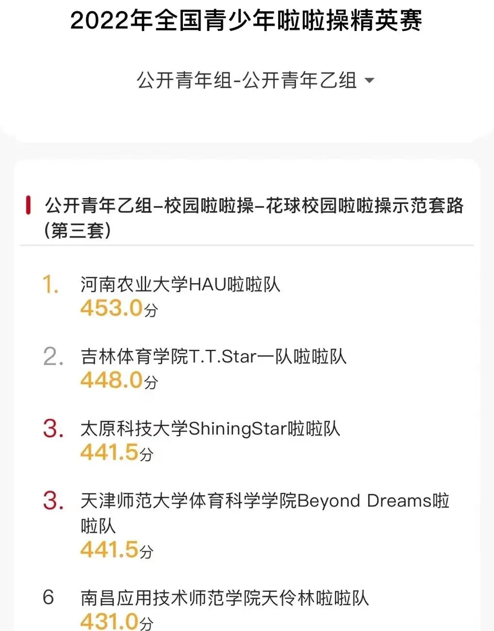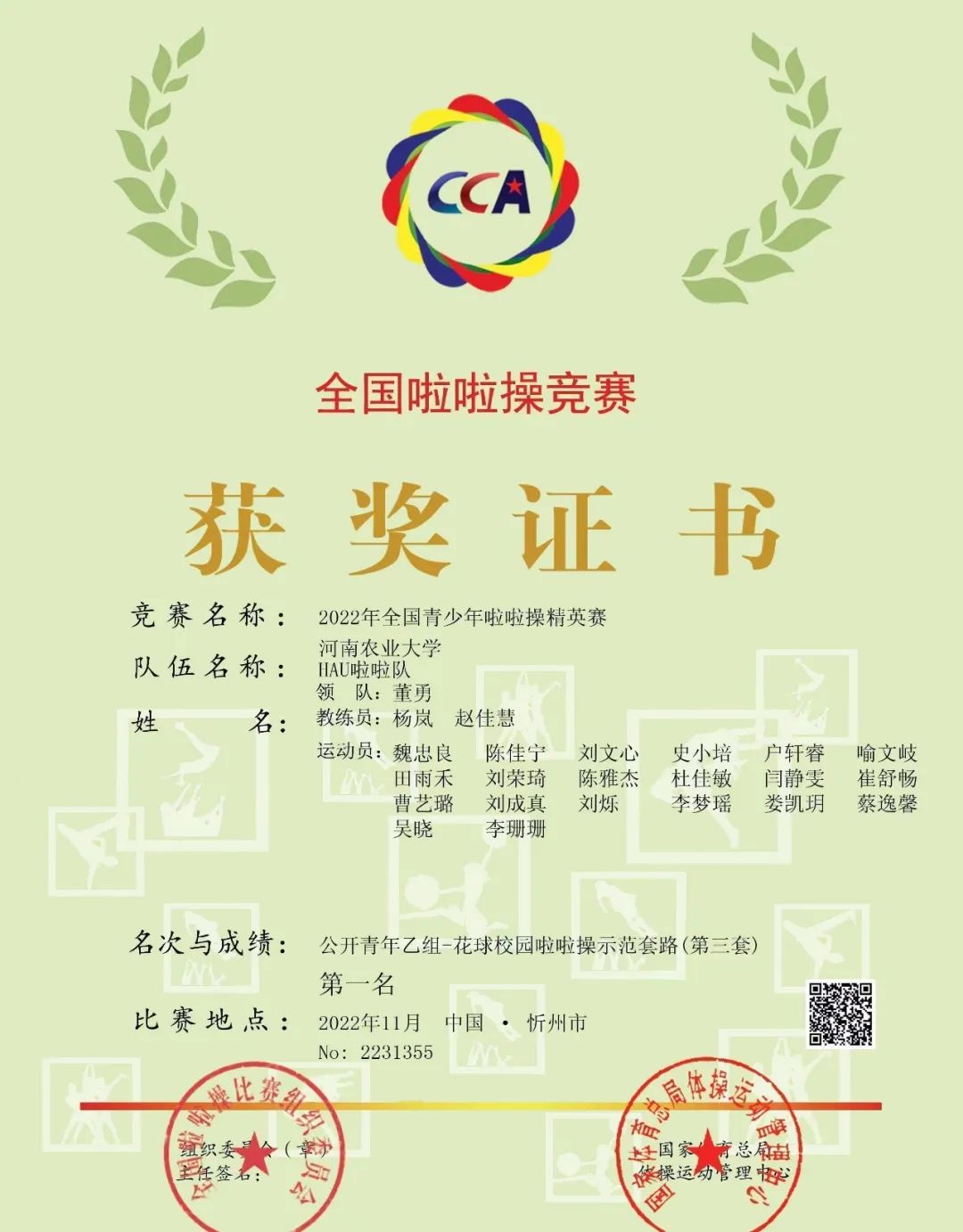 经过紧张激烈的角逐,我校在此次比赛中取得公开青年乙组-校园啦啦操-花球校园啦啦操示范套路(第三套)第一名。此次获奖,离不开91猫先生 领导的大力支持和老师们的悉心指导,也是啦啦操队员们共同努力的结果!啦啦操代表队表现出不畏艰苦、精益求精、团结拼搏、永争第一的精神,体现出了新时代大学生的青春风采。相信他们能站在更高更大的领奖台上!
