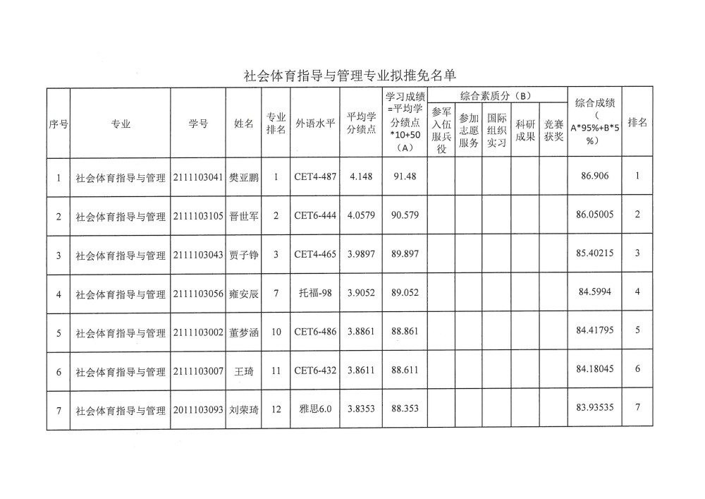 二、各专业名额:社会体育指导与管理专业7名;舞蹈表演专业6名