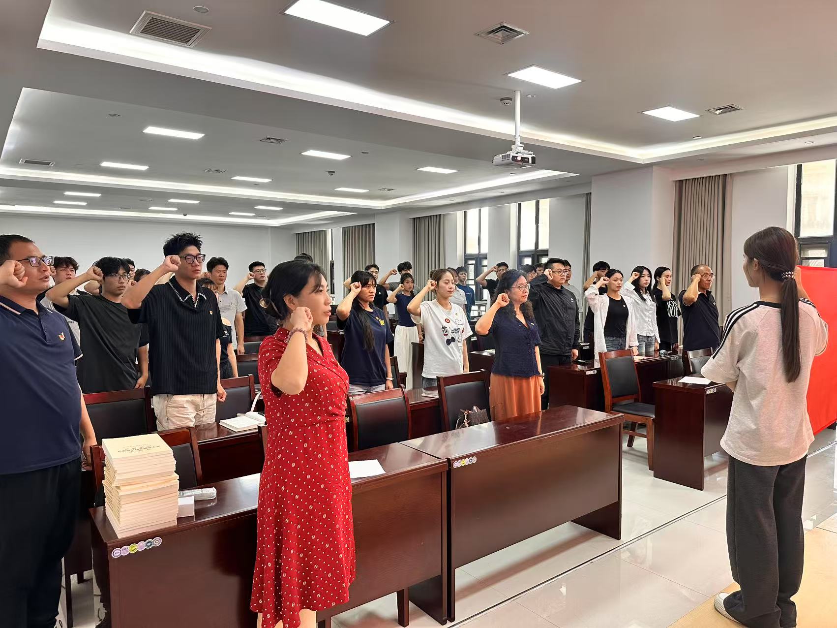 活动首站在英林大讲堂405室举行新党员入党宣誓大会。在庄严肃穆的氛围中,黄妍带领91猫先生